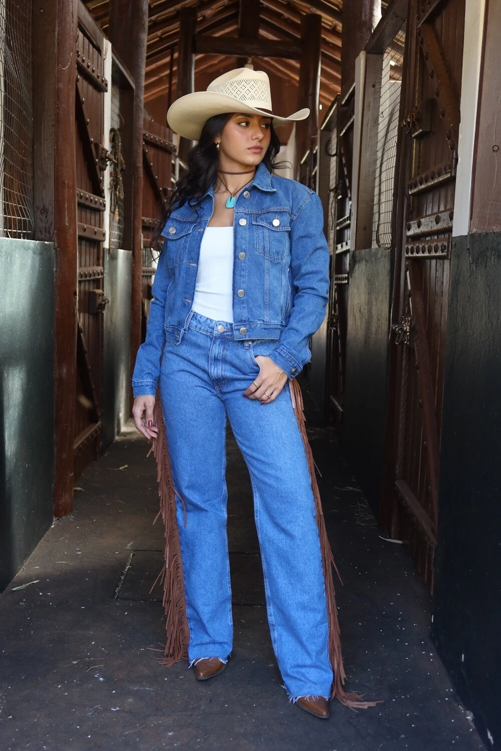 Jaqueta e Calça Wide Leg Jeans com Franjas em Couro