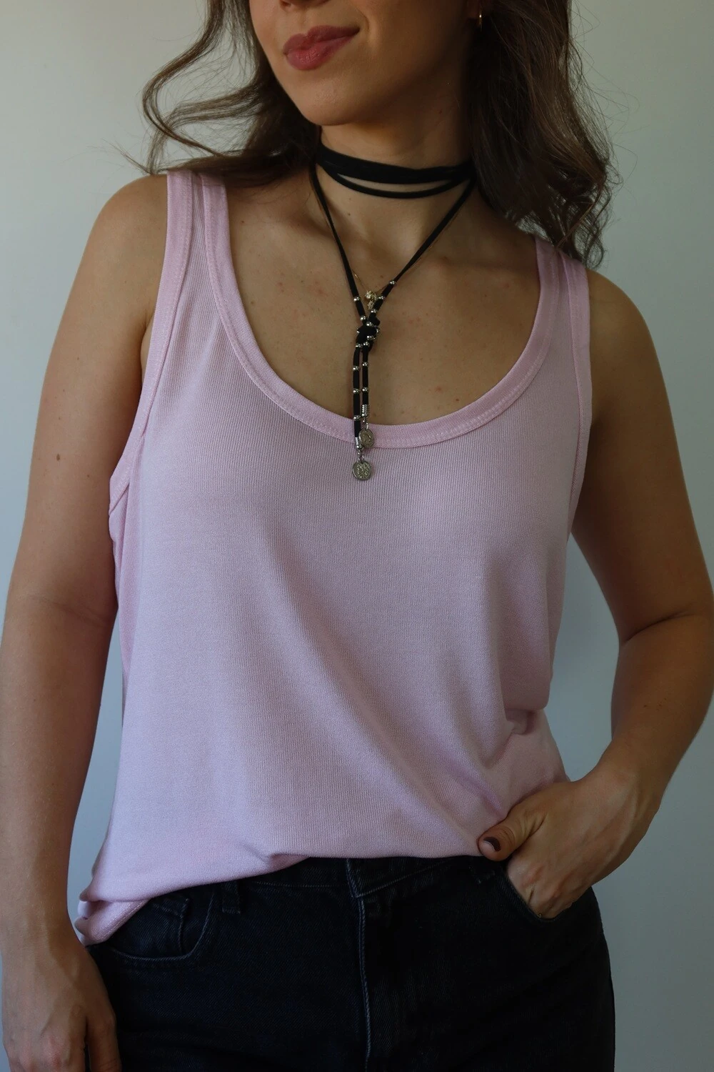 Delicada e confortável, a Regata Rosa é feita em modal com elastano, proporcionando toque suave e ajuste perfeito ao corpo. Ideal para quem busca praticidade no dia a dia sem abrir mão de estilo e feminilidade.